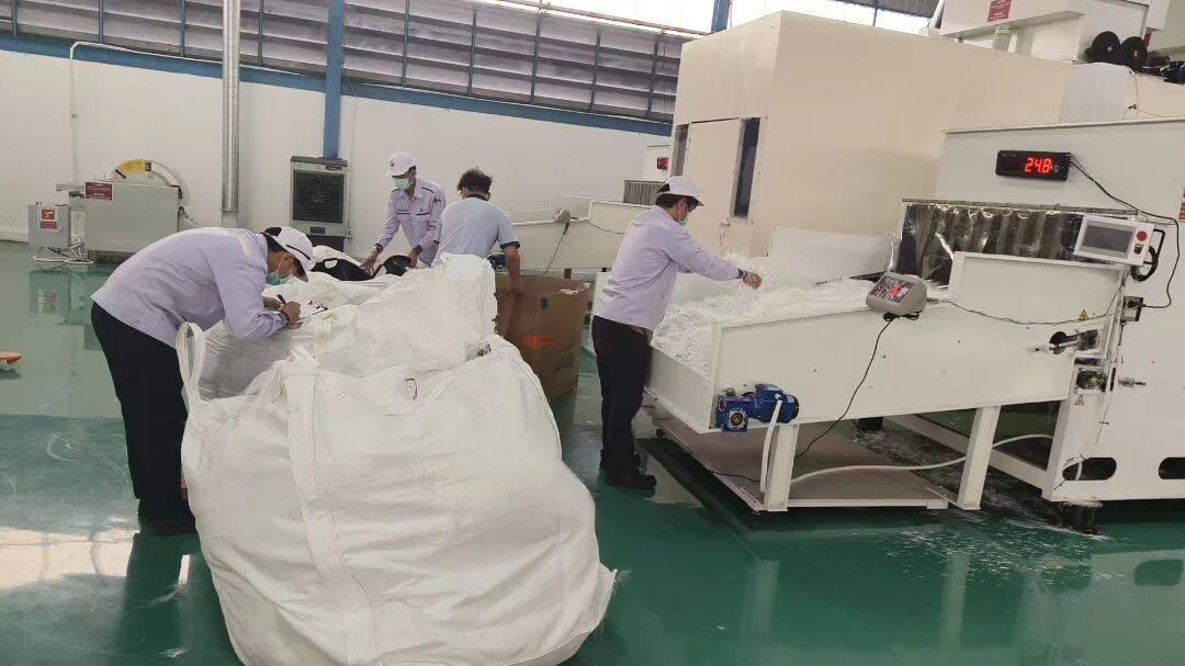近日,在重庆璨月新材料有限公司(以下简称:璨月公司)泰国复合型材料工厂,自动化设备火力全开,一条刚刚投产的玻璃纤维针刺毡生产线正如火如荼忙生产。