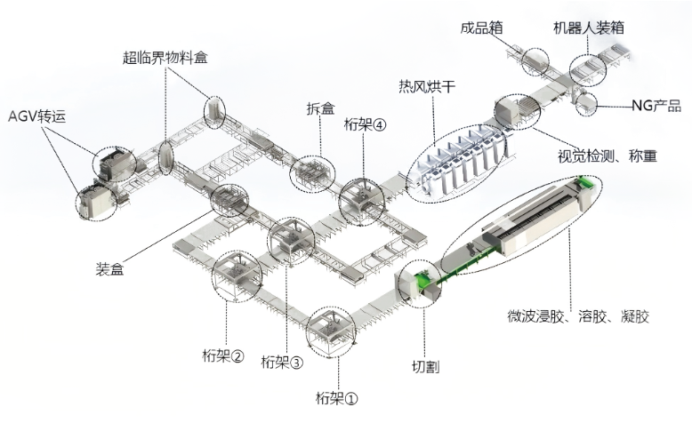 该套设备深度融合了浸胶预处理、凝胶稳定成型、高效微波固化、自动化物料流转、高精度切割成型、AGV(自动引导车)智能调度与精准运输、热风循环烘干系统,以及视觉识别与精确称重的多维度缺陷检测与自动筛选装盒等先进工艺,形成了从原材料输入到成品输出的高度集成、智能化、高效率的自动化生产流水线。