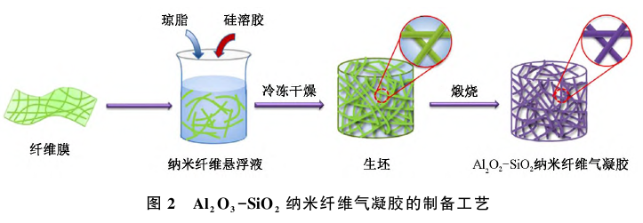 Al2O3通常与其他元素(Si、B、Mg等)化合以提高制备Al2O3基纤维气凝胶的热稳定性。Liu等展示了Al2O3-SiO2纳米纤维气凝胶的典型制备工艺(见图2),将纳米纤维膜分散后与琼脂混合于硅溶胶中,通过冷冻干燥、高温煅烧得到最终产品,所制备的Al2O3-SiO2纳米纤维气凝胶具有超轻质性能。随后该课题组用类似的方法制备出了Al2O3-B2O3纳米纤维气凝胶,该材料表现出较高的抗压强度(4.11MPa)及极低的导热系数(0.11W/(m·K))。