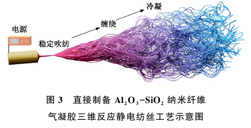 此外,Cheng等采用三维反应静电纺丝法,使用可纺溶胶制备了Al2O3-SiO2纳米纤维气凝胶(见图3),纺丝液中聚合物的添加量极低,而纺丝液的凝胶化未受到影响。通过控制溶胶射流的速率实现对三维交织卷曲纳米纤维结构的控制,所获得的Al2O3-SiO2纳米纤维气凝胶显示出独特的结构,这是在煅烧过程中产生随机缠绕的卷曲纤维,并通过键合和接触点相互连接形成的。