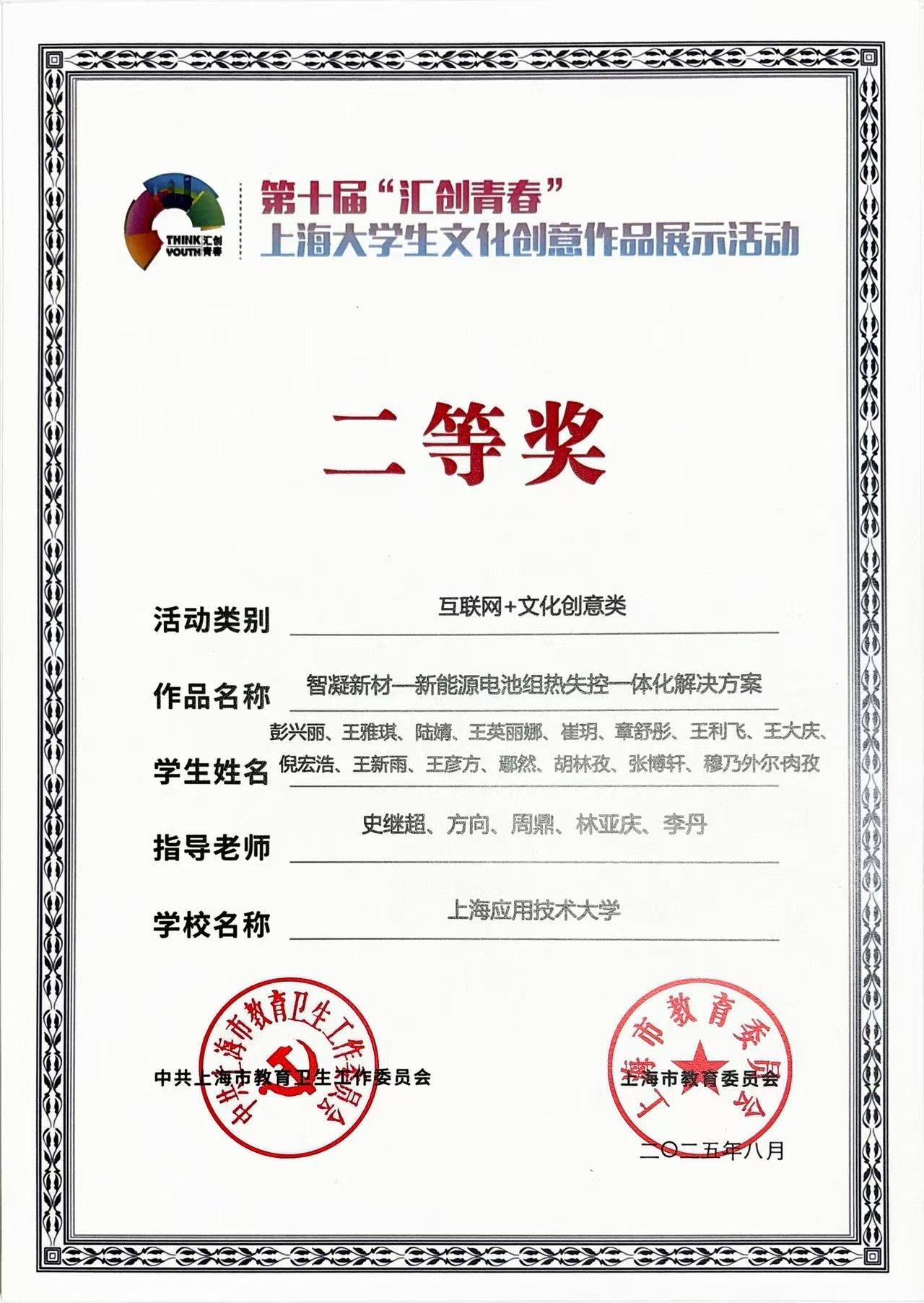 近日,星海创立方“智凝新材——新能源电池组热失控一体化解决方案”在孵大学生创业项目获第十届“汇创青春”上海大学生文化创意作品展示活动互联网+文化创意类二等奖。