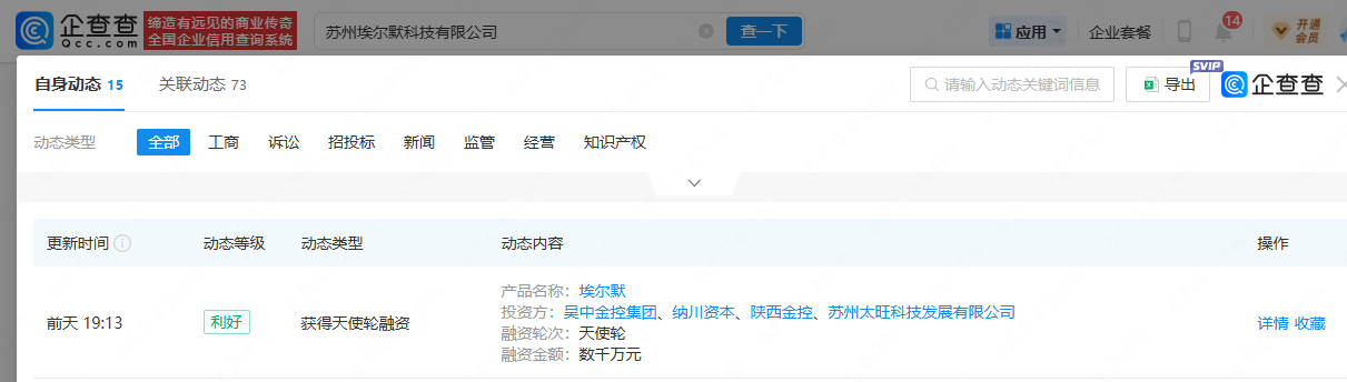 在哈尔滨工业大学院士团队的领衔下,苏州埃尔默科技有限公司于12月9日获得数千万元天使轮融资,投资方包括纳川资本、陕西金控等机构。