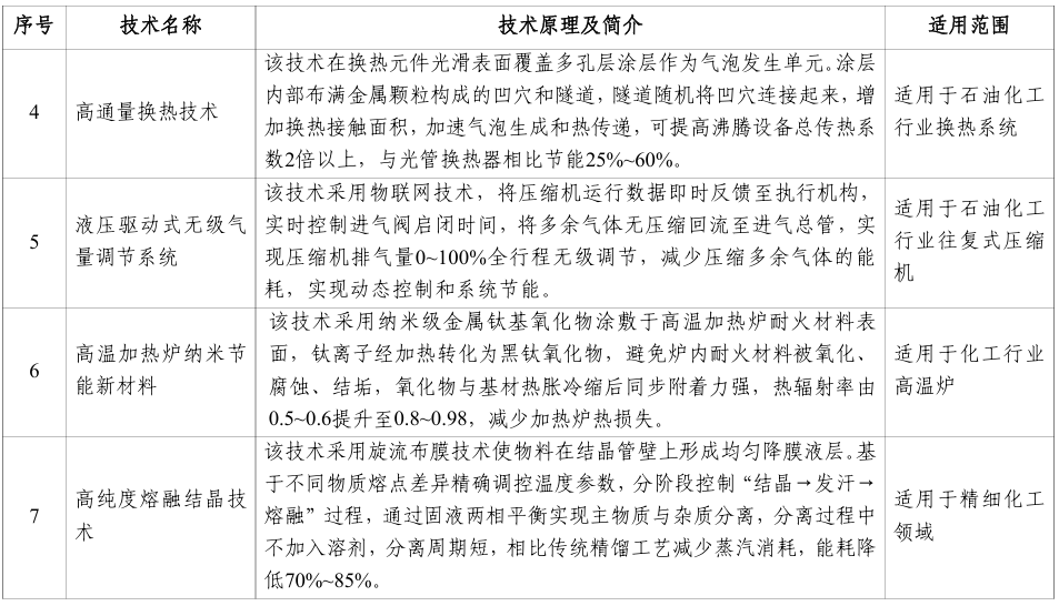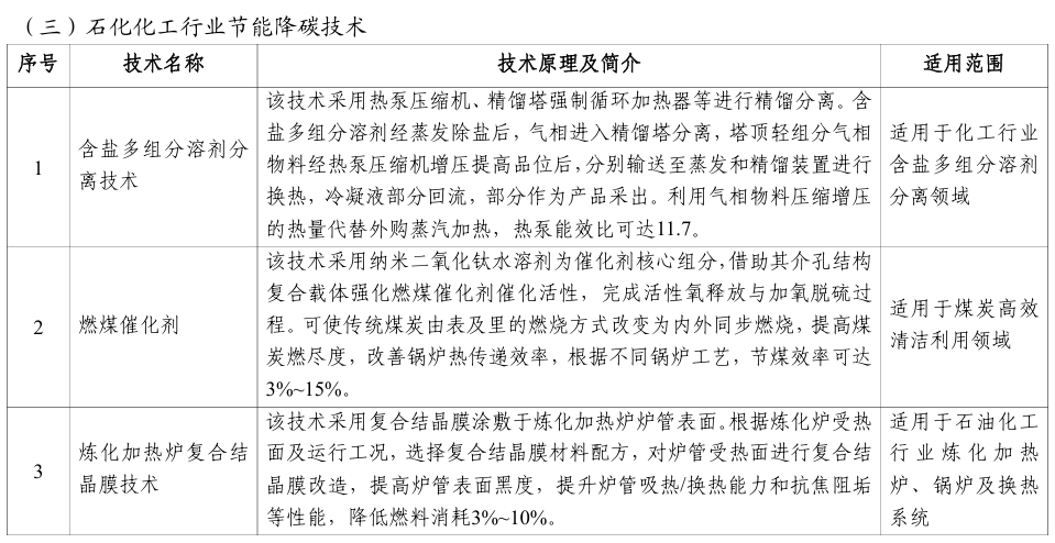 其中,石化化工行业节能降碳技术有10项,分别是含盐多组分溶剂分离技术、燃煤催化剂、炼化加热炉复合结晶膜技术、高通量换热技术、液压驱动式无级气量调节系统、高温加热炉纳米节能新材料、高纯度熔融结晶技术、臭氧高级氧化、纳米气凝胶材料工业节能技术、水基岩屑微生物处理土壤化利用技术。