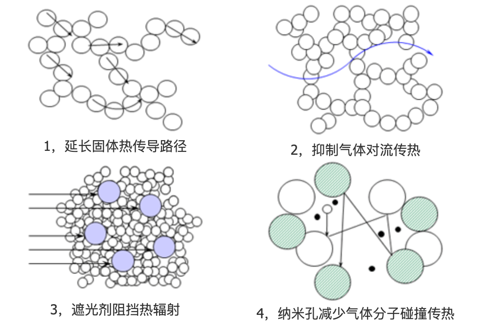 • 抑制热传导:二氧化硅粒子的微孔球状结构使粒子之间只能以单个的点式接触,接触面积小,从而限制了热传导路径,极高的孔隙率使得固体骨架含量极低,传热路径曲折漫长,由此使得热传导能量被降至最低。