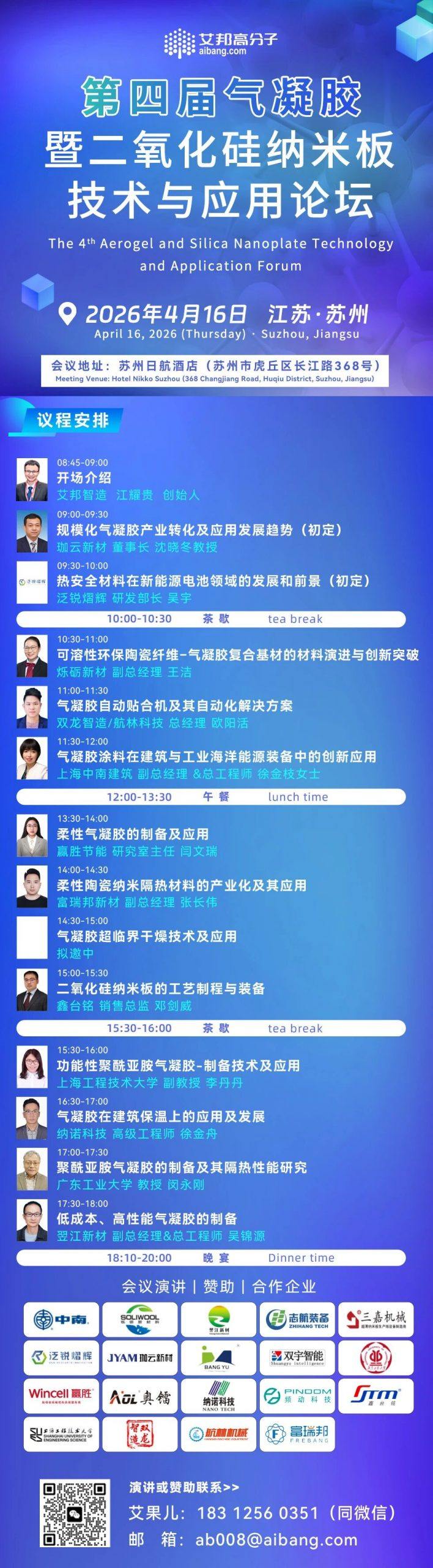 邀请函:第四届气凝胶暨二氧化硅纳米板技术与应用论坛(2026年4月16日 苏州)