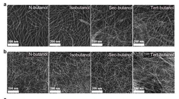 作者进一步展示了Gd-SNWs在丁醇异构体中的分散行为及其凝胶组装过程(图2。随着丁醇支链数量的增加(从正丁醇到叔丁醇),Gd-SNWs的聚集程度逐渐增强,纤维束增粗且交错程度增加(图2a)。当引入柠檬酸后,Gd-SNWs在不同丁醇体系中形成凝胶(SNWGs),其微观结构演变与分散状态相对应(图2b)。