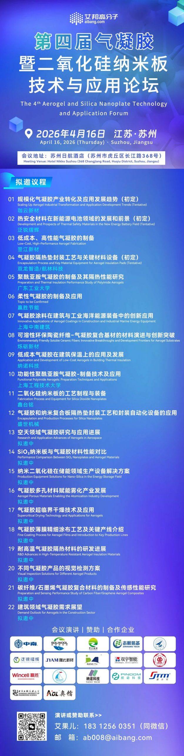邀请函:第四届气凝胶暨二氧化硅纳米板技术与应用论坛(2026年4月16日 苏州)