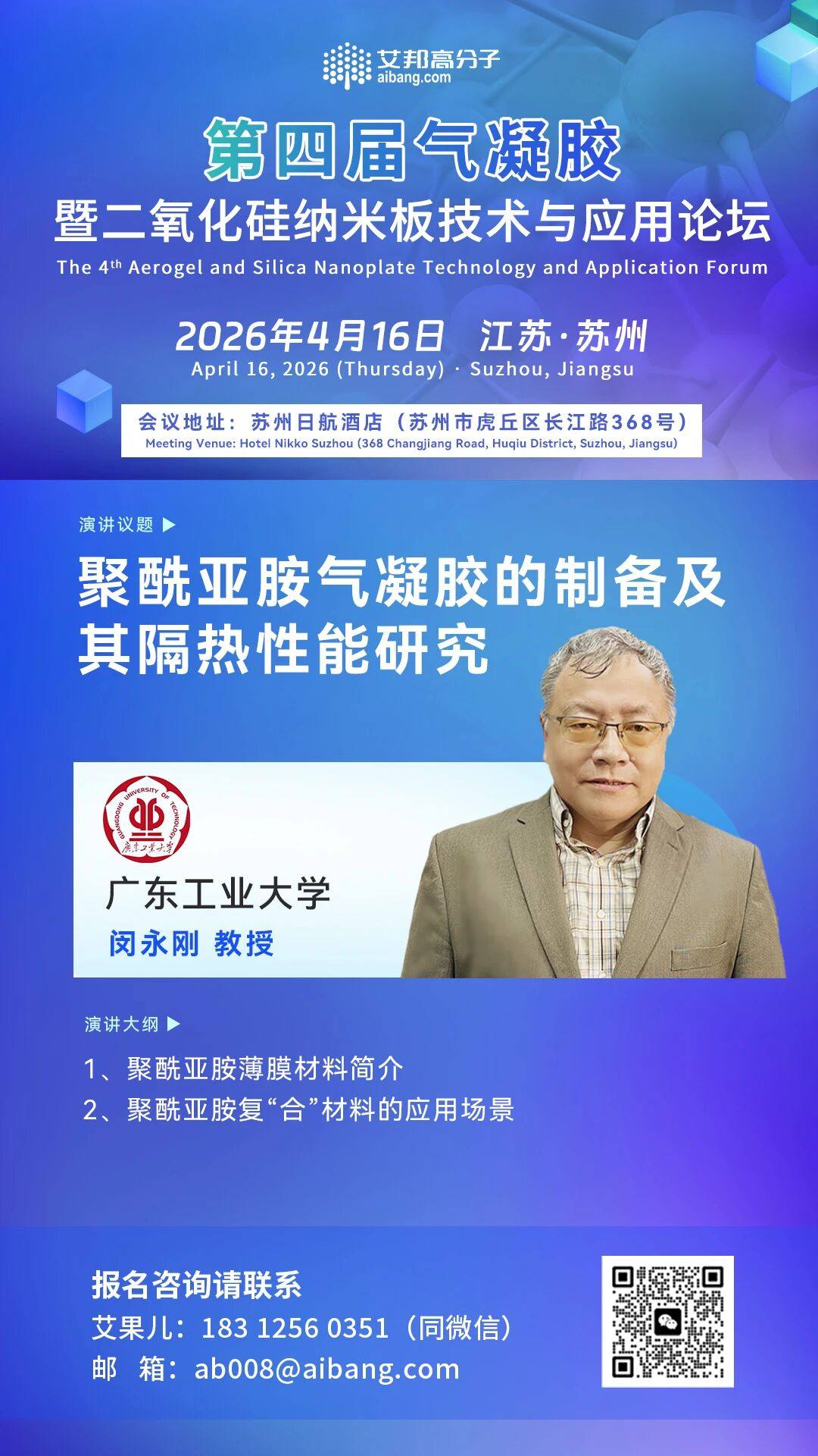 📢4月16日,广东工业大学 闵永刚教授,将莅临艾邦高分子第四届气凝胶暨二氧化硅纳米板技术与应用论坛📍苏州,并将带来聚酰亚胺气凝胶的制备及其隔热性能研究的主题演讲!敬请期待!