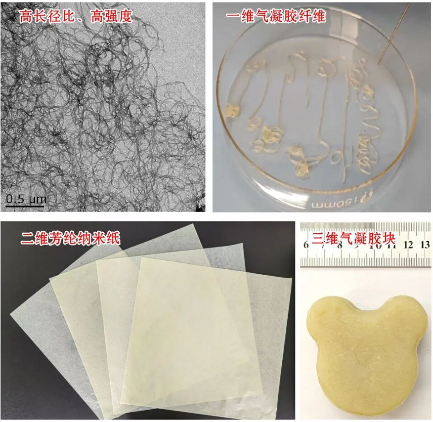 对位芳纶短纤一步转换制备的芳纶纳米纤维湿凝胶易存储运输,具有高度可加工性。可定制制备芳纶气凝胶纤维、芳纶纸及三维块状气凝胶。