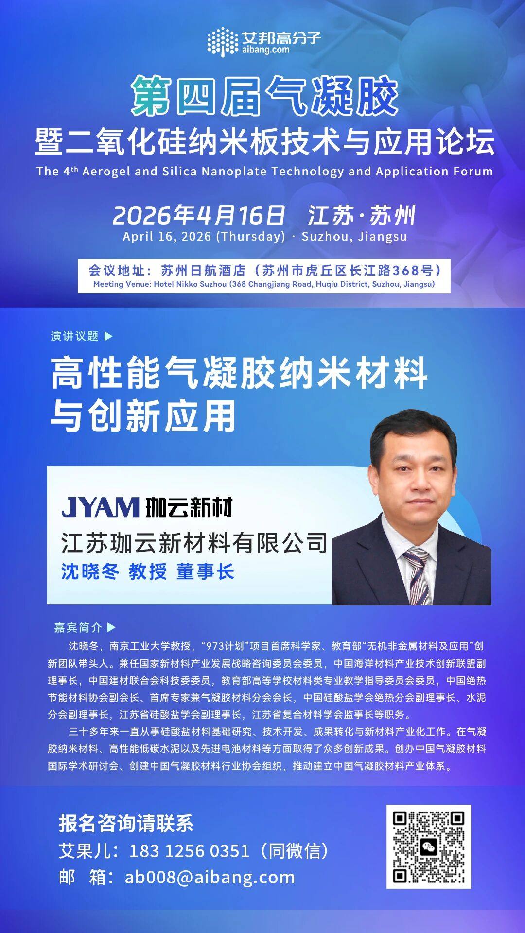 📢4月16日,江苏珈云新材料有限公司 董事长 沈晓冬教授 ,将莅临艾邦高分子第四届气凝胶暨二氧化硅纳米板技术与应用论坛📍苏州,并将带来《高性能气凝胶纳米材料与创新应用的主题演讲!敬请期待!