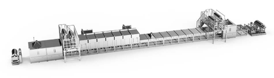 全自动气凝胶微波设备深度融合了浸胶预处理、凝胶稳定成型、高效微波固化、自动化物料流转、高精度切割成型、AGV(自动引导车)智能调度与精准运输、热风循环烘干系统,以及视觉识别与精确称重的多维度缺陷检测与自动筛选装盒等先进工艺,形成了从原材料输入到成品输出的高度集成、智能化、高效率的自动化生产流水线。