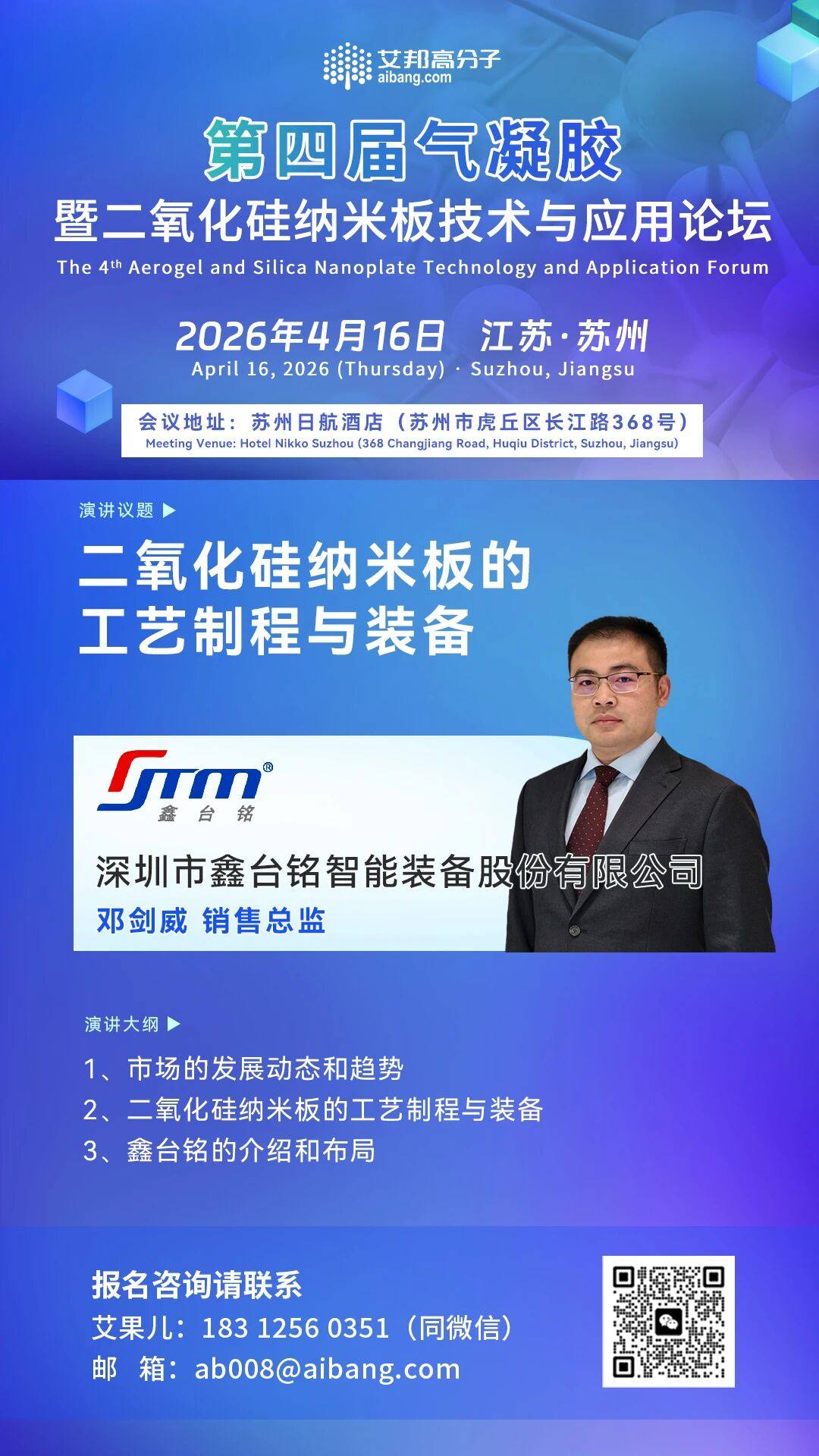 📢4月16日,深圳市鑫台铭智能装备股份有限公司 销售总监 邓剑威,将莅临艾邦第四届气凝胶暨二氧化硅纳米板技术与应用论坛📍苏州,并将带来《二氧化硅纳米板的工艺制程与装备》的主题演讲和展台展示。